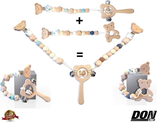 Deze set bestaat uit twee koorden: een speenkoord/Bijtringkoord/Babyspeelgymkoord, en wanner deze twee koordjes aan elkaar zijn vastgemaakt met de rammelaar kun je hem gebruiken als een kinderwagen-slinger/wagenspanner voor het Maxi-cosi, autostoeltje of kinderwagen. We weten allemaal dat wanneer onze baby tandjes krigt, de baby zich erg ongemakkelijk zal voelen en alles in hun mond zal stoppen, maar het zou geen probleem zijn. Deze wagenspanner kun je vastklikken met de speenclips aan de kinderwagen, Maxi Cosi of autostoeltje. De Bijtringkoord en Speenkoord is makkelijk te bevestigen aan de kleding die je baby draagt en beschadigt de kleding niet. (BELANGRIJK – NOOIT een speenkoord/bijtringkoord bevestigen aan dekens, andere touwtjes of veters, of iets dat losligt in de wieg of kinderwagen). Deze set bevat 1 x speenkoord en 1 x bijtringkoord plus 1 x beukenhout Bijtring and 1 x beukenhout rammelaar. Je kunt de twee koorden met de rammelaar verbinden om een kinderwagenspanner te maken die ook aan de maxi-cosi of het babyautostoeltje bevestigd kan worden. (BELANGRIJK – Bevestig NOOIT de wagenspanner aan de kleding van je baby, bevestig de wagenspanner alleen aan de stof van de kinderwagen, babyautostoel of maxi-cosi). Aan alles is gedacht: praktische bevestiging, geluidjes, vrolijke kleuren, diverse structuren en speelse details. Kinderziektes kralen, stimuleert visuele, motorische en sensorische ontwikkeling. Leuk babyshower / kraamcadeau! Veiligheid is altijd onze eerste zorg. Houten kralen, houten clips, houten bijtring en houten rammelaar zijn Europees gecertificeerd en veilig om in contact te komen met de mond van de baby en zijn bestand tegen speeksel. Onze houten kralen, clips, rammelaars en bijtringen zijn gemaakt van beukenhout en zijn milieuvriendelijk. Kralen en clips zijn gecertificeert volgens de Europese normen EN71: 3 en EN71: 9 en bevatten geen schadelijke stoffen zoals formaldehude, PCB, PCP, lindaan, DMF, polyurethaan, isocyanaat of zware metalen, geen biociden of houtconserveringsmiddelen in overeenstemming met de geldige Biocidenrichtlijn 98/8 / EG FF, er zijn ook geen weekmakers op basis van ftalaat zoals DEHP, DBP, BBP, DINP, DIDP, DIBP, DNOP of hun wijzigingen en geen polycyclische aromatische koolwaterstoffen (PAK). Ze zijn ook extreem breukvast. (Houtkleuren kunnen verschillen) Het nylon koord is heel veilig, wat extra veiligheid biedt, de uitenden zijn verbrandt om de knopen op hun plaats te houden (het koord is gesmelten om de knoop vast te zetten). ONDERHOUDSINSTRUCTIES: Houten kralen, bijtringen en rammelaars kunnen onder stromend water worden afgespoeld en direct zorgvuldig worden afgeveegd en gedroogd me een zachte handdoek. Verpakking bevat: 1 x Bijtringkoord 1 x Babyspeeltjekoord/Fopspeenkoord 1 x Beukenhout Houten Bijtring Beer ontwerp 1 x Beukenhout Biologische baby rammelaar beer vorm (Met Nederlands en Engels veiligheidsinstructies) Veiligheid Laat de baby nooit alleen spelen met de wagenspanner/Speenkoord/Bijtringkoord/ Babygym Speeltjes/Rammelaar en Bijtring ze zijn alleen te gebruiken onder toezicht van volwassenen. Controleer de wagenspanner/Speenkoord/Babygym Speeltjes/rammelaar en bijtring regelmatig op slijtage door gebruik.